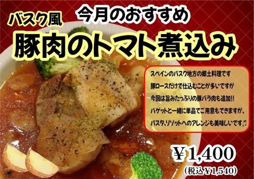 今月のおすすめは、バスク風 豚肉のトマト煮込み!バゲットと一緒に単品でご用意もできますが、パスタ、リゾットへのアレンジも美味しいです♪