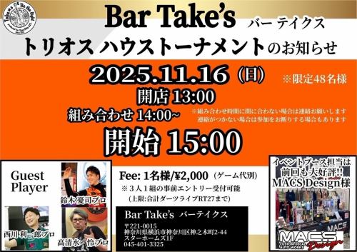 【ダーツバーとしても有名】大口で貸切出来る店舗を探されている方に最適のBar Take's◎落ち着いたアットホームな空間で本格的なお料理やダーツを思う存分楽しんでいただけます。近隣の会社様の宴会/歓送迎会/に良くご利用されています!ダーツのライセンスを持っているスタッフもいるので安心☆